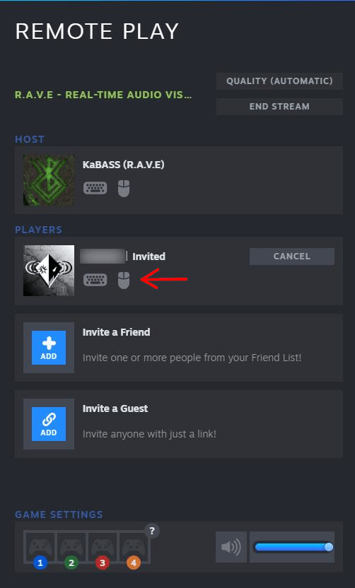 4. After your friend accepts the invite, allow them to control the character by clicking the keyboard and mouse icons under their username. You can also invite more friends using this menu.